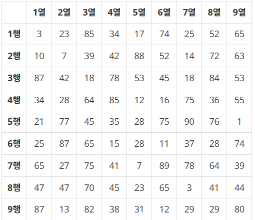 - 해당 행의 아홉개의 열들을 일일이 확인